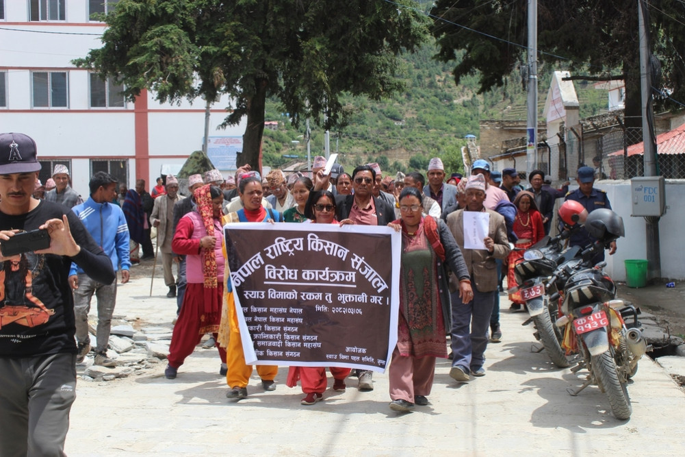 उनीहरुले सदरमुकाम खलंगाको बालमन्दिर नजिकैबाट जिल्ला प्रशासन कार्यालयसम्म नाराबाजी गर्दै जुलुस निकाले । स्याउ बिमा पहल समिति संयोजक खड्कबहादुर सेजुवालले किसानलाई बिमा बापतको रकम दिन आलटाल गरेकोमा दुःख व्यक्त गर्नुभयाे । उहाँले भन्नुभयाे ‘बिमा रकम तत्काल उपलब्ध गराउनुपर्छ भनेर धेरैपटक माग राख्यौं । तर बिमा कम्पनीले अटेर गरेकोले सडकमै उत्रिएर आन्दोलनका कार्यक्रम सुरु गर्यौं ।’ गत वर्ष खडेरीले स्याउ फलेन र फलेको स्याउ पनि असिनाले झारिदिएको थियो । बिमा रकम नदिएर किसानलाई राज्यले अपमान गरेको किसानहरुको ठहर छ ।