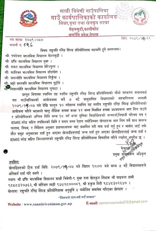 सान्नी त्रिवेणी गाउँपालिका शिक्षा यूवा तथा खेलकुद शाखाले आज एक सुचना जारी गर्दै पालिकामा रहेका ७ वटै माध्यामिक विद्यालयको सहभागिताका लागि अनुरोध गरेको छ । चालु शैक्षिक सत्रमा कक्षा १२ सम्म नियमित रुपमा अध्ययनरत विद्यार्थिले भाग लिन पाउने र प्रतियोगिताको अन्तिम मिति सम्म १८ वर्ष भन्दा मुनिका विद्यार्थिहरुलाई खेलमा सहभागि गराउन सुचनामा उल्लेख गरेको छ ।